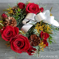 クリスマスの食卓を華やかに彩る、バラ・松ぼっくり・リボンをあしらったクリスマスカラーのリースです。