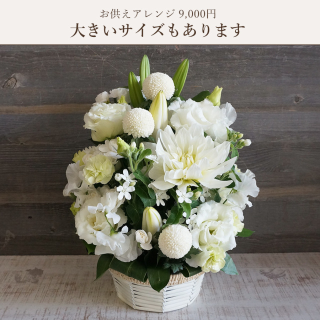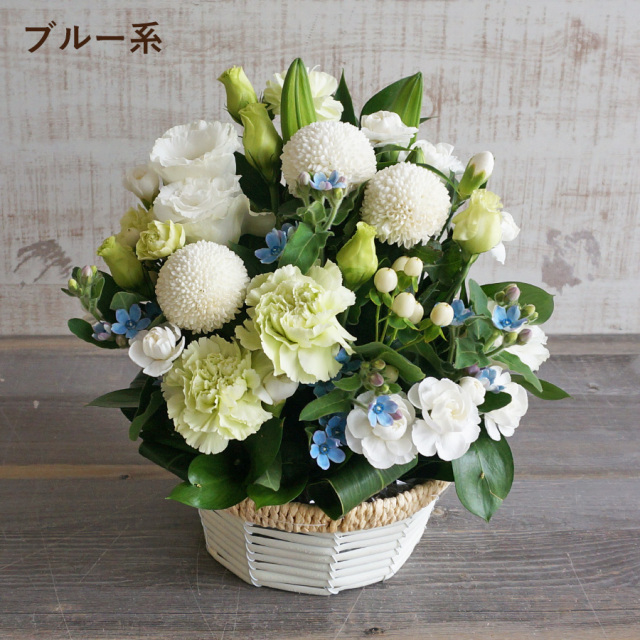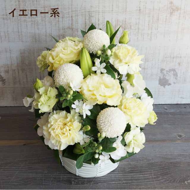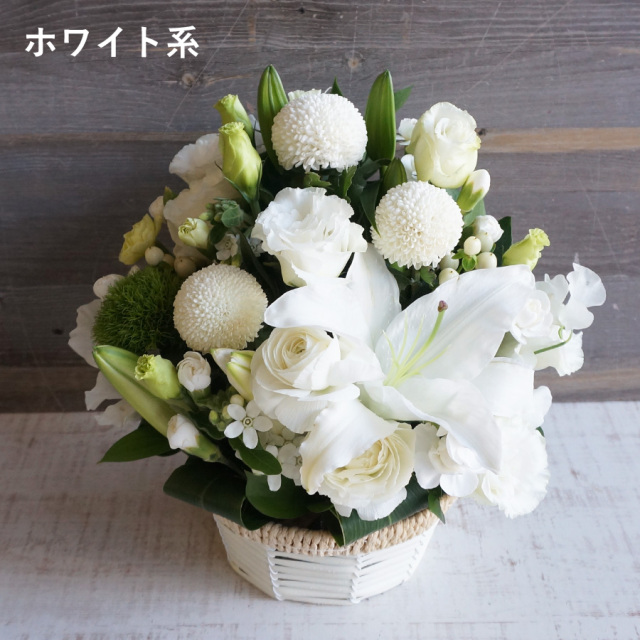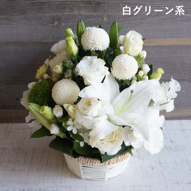 故人との関係性、イメージ、伝えたいメッセージにより有色のお供え花もおすすめです。白グリーンをベースにお作りします。