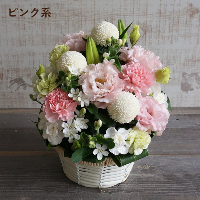 花材 : マム(菊)、トルコキキョウ、カーネーション、ユリ、ガーベラなど季節のお花