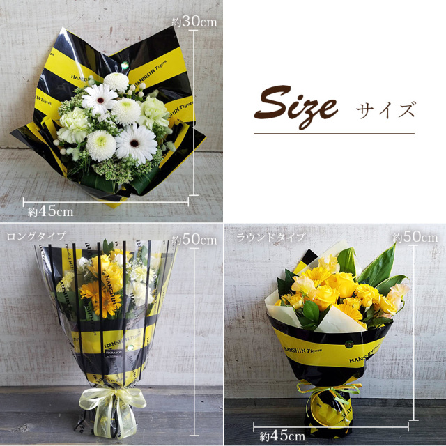 サイズ : 花束(ロング) 高さ約50cm、花束(ラウンド) 高さ約50cm、アレンジメント 高さ約45×幅約30cm