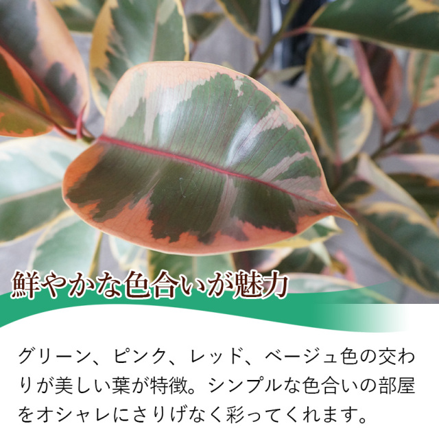 フィカス・ルビーは、グリーン・ピンク・レッド・ベージュが入り混じる葉が美しく、見ごたえのある観葉植物です。