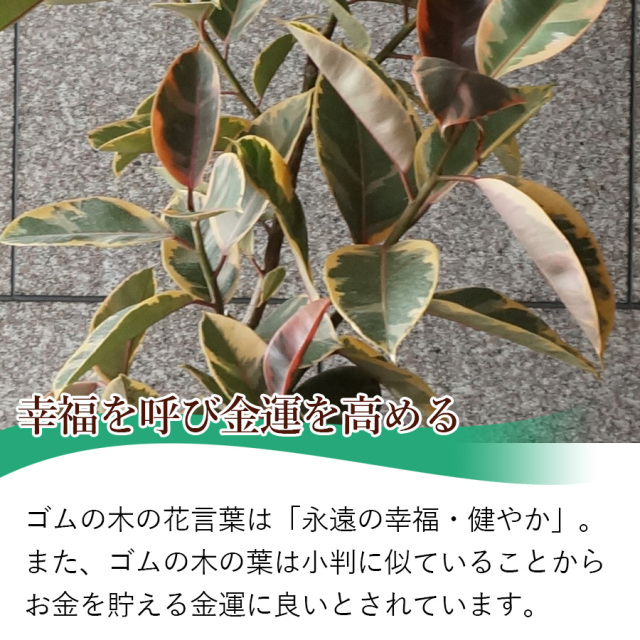 ゴムの木の葉の形が小判に似ていることから、お金を貯える金運アップの効果があると言われています。