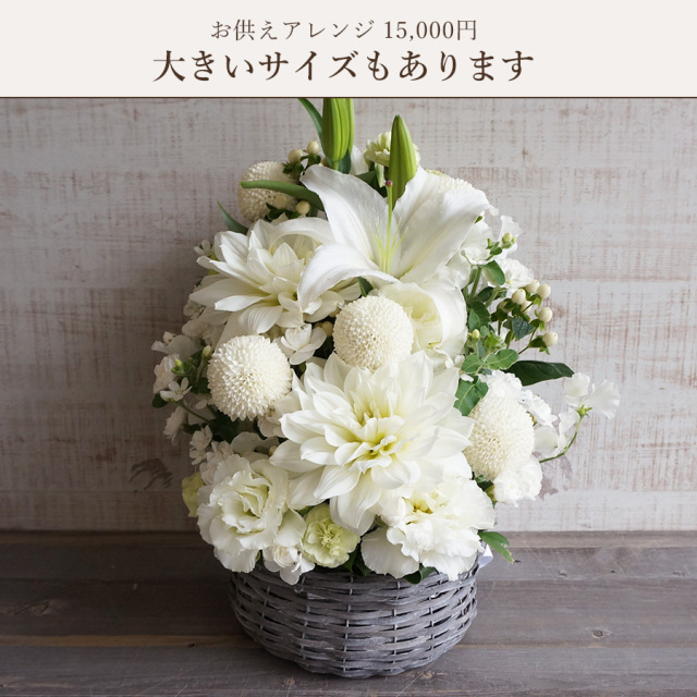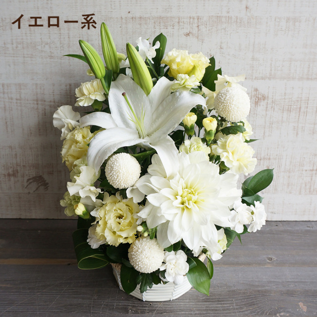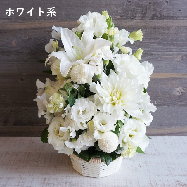 故人との関係性、イメージ、伝えたいメッセージにより有色のお供え花もおすすめです。白グリーンをベースにお作りします。