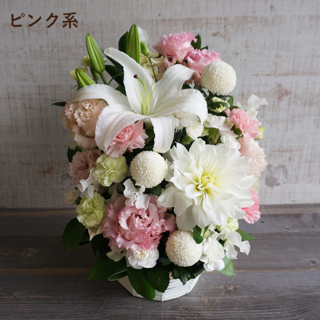 花材 : マム(菊)、トルコキキョウ、カーネーション、ユリ、ガーベラなど季節のお花