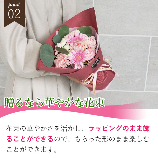 祖母の快気祝いに送りました。花束単体で飾れるためすぐに飾って楽しんでくれたようです。事前に写真で確認できたので安心しました。
