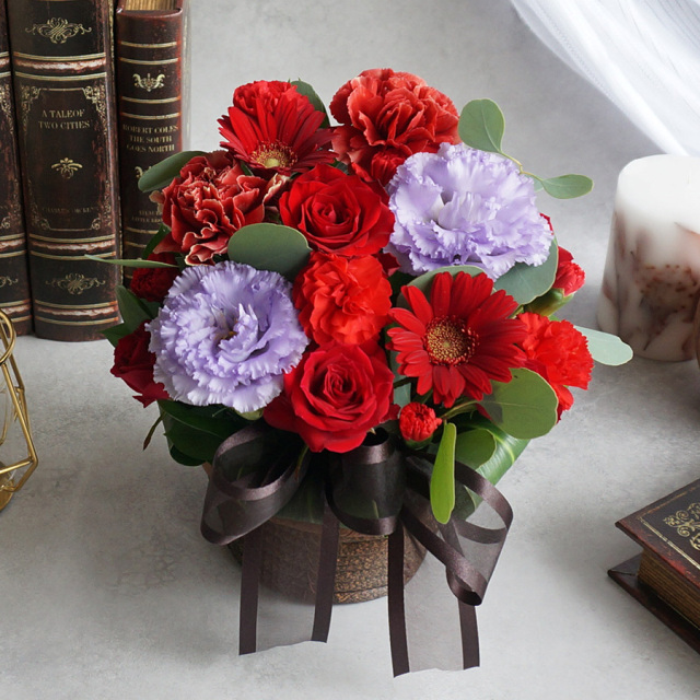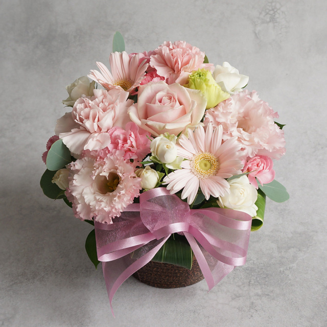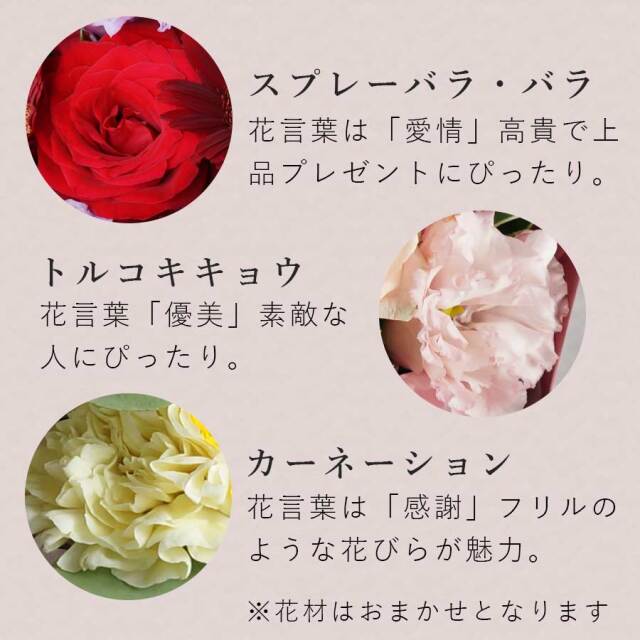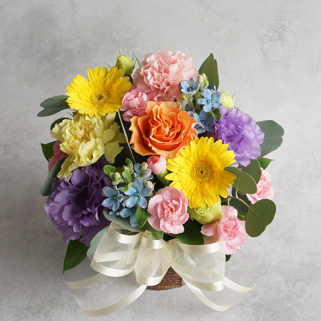 花材 : バラ、スプレーバラ、カーネーション、ガーベラ、ユーカリなど季節の花