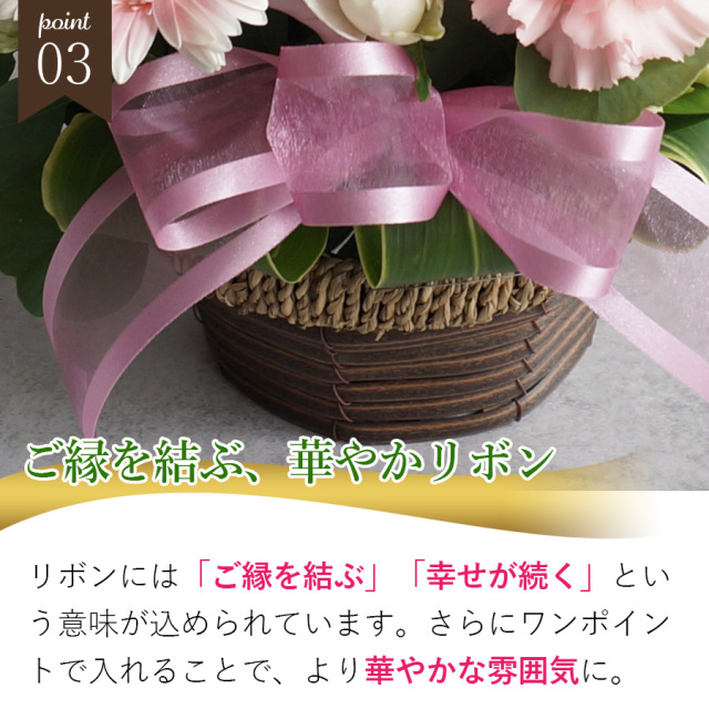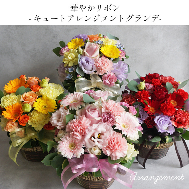 季節のお花とリボンあしらった可愛いアレンジメントです。