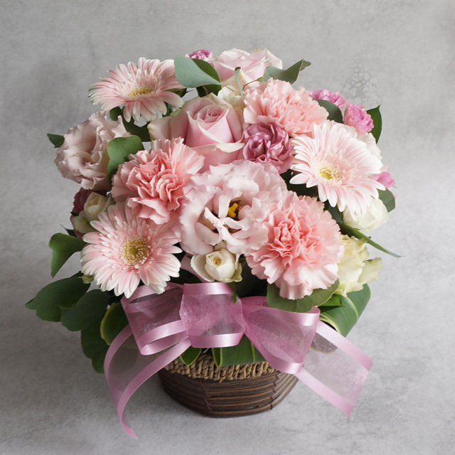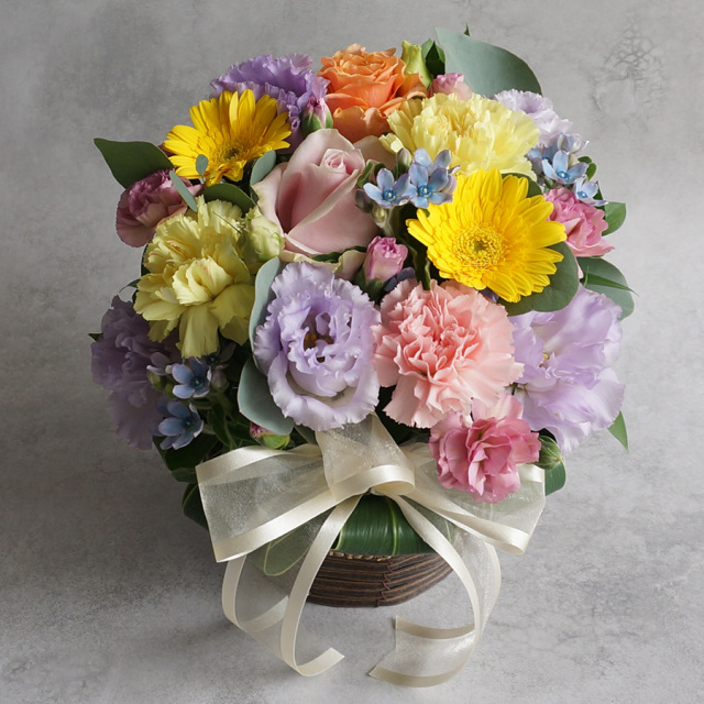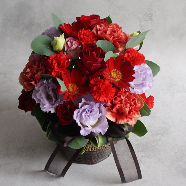 花材 : バラ、トルコキキョウ、カーネーション、ガーベラ、ユーカリなど季節の花