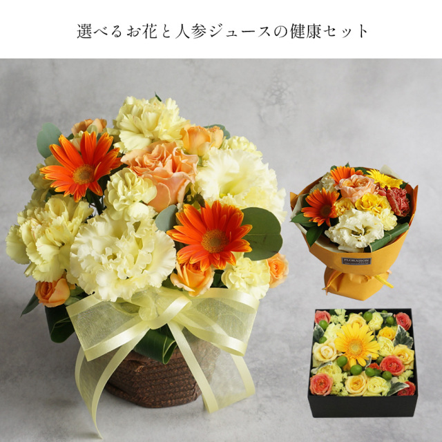 選べるお花(アレンジメント・スタンディングブーケ・ボックスアレンジメント)とニンジンジュースパウチ