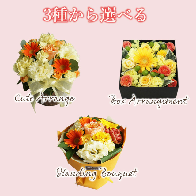 シーンや好みに合わせてキュートアレンジメント、スタンディングブーケ、ボックスアレンジメントからお選びください。