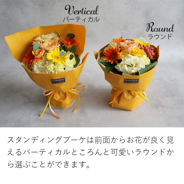 花瓶いらずでそのまま飾れるスタンディングブーケ。ラウンドとバーティカルから選べます。