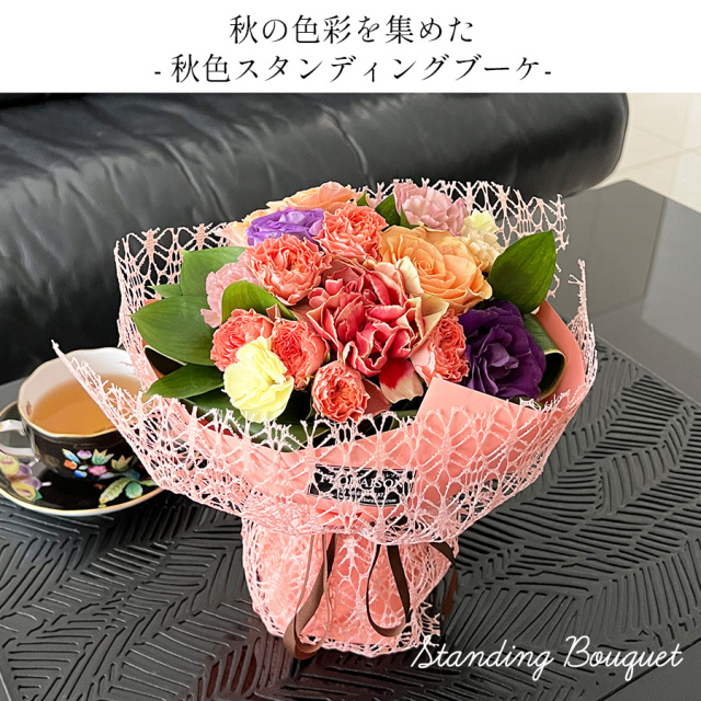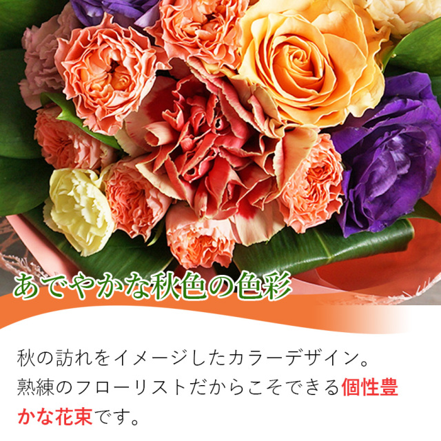秋の訪れとフラワーギフトとしての華やかさをイメージしたカラーデザイン。赤・紫・オレンジ・ピンクなどの多色使いはフロレゾンならでは。 熟練のフローリストだからこそできる個性豊かなデザインです。華やかさがほしいけれど、平凡なデザインじゃつまならいという方におすすめ。