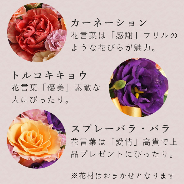 ※画像、花材は一例です。ご注文のタイミングによりお花の種類は異なります。御要望がある場合はご注文時に記載いただくか事前にお問合せ下さい。