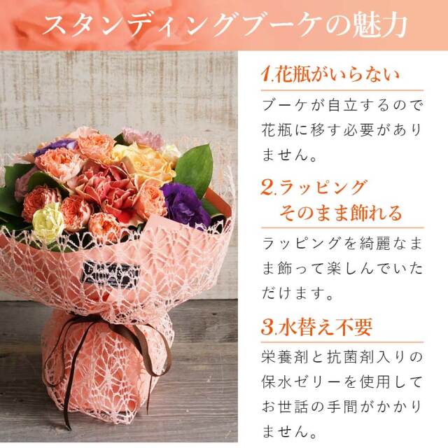 自立式の花束なので花瓶がいらず、届いてすぐにかざることができます。