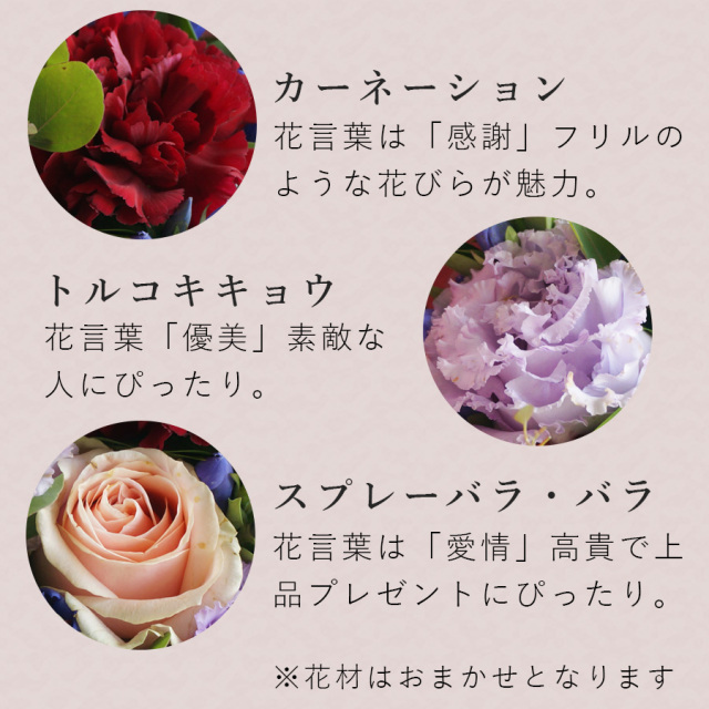 ※画像、花材は一例です。ご注文のタイミングによりお花の種類は異なります。御要望がある場合はご注文時に記載いただくか事前にお問合せ下さい。