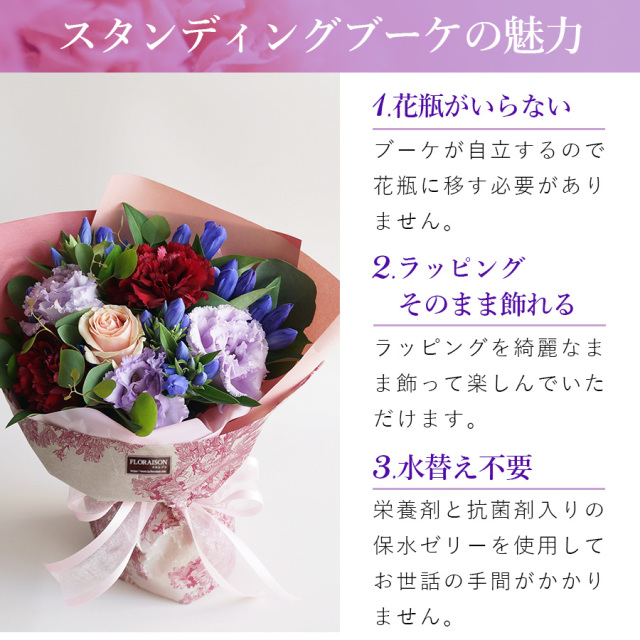 秋の代表、りんどうを使用したスタンディングブーケです。