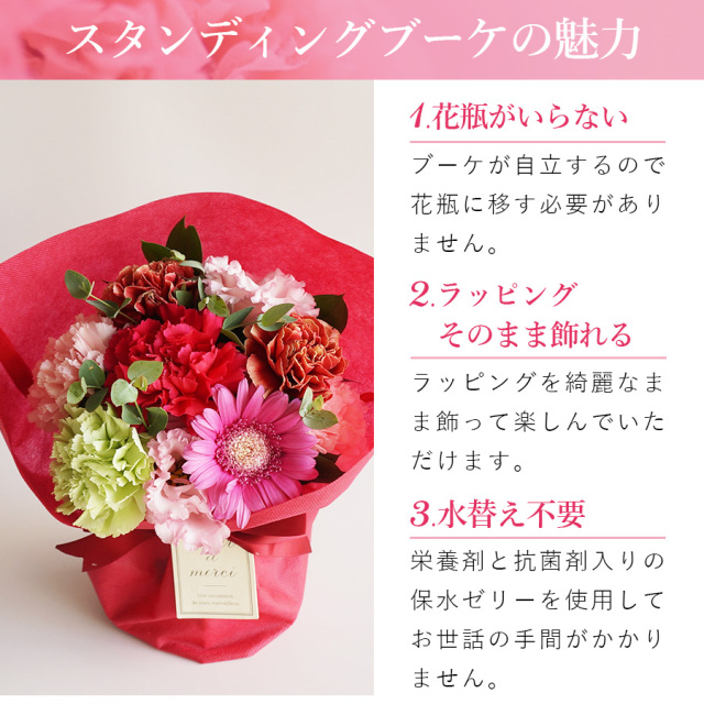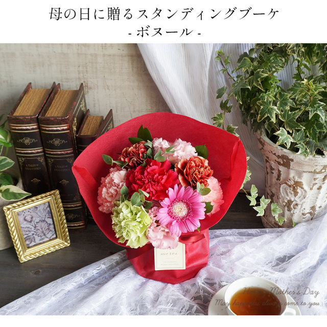 母の日に贈るスタンディングブーケ「ボヌール」です。