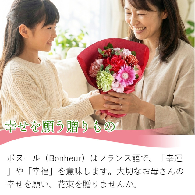 ボヌール(Bonheur)はフランス語で「幸運」や「幸福」を意味します。大切なお母さんのこれからも幸せでありますようにと願い込めて、この花束を贈ってみてはいかがでしょうか。