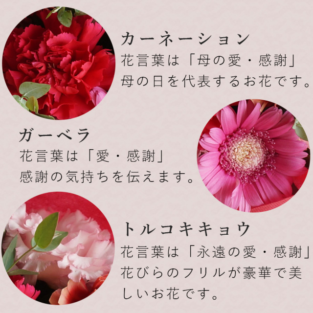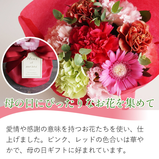 愛情や感謝の意味を持つお花たち、カーネーション・スプレーバラ・ガーベラを使い、赤とピンクのグラデーションで仕上げました。