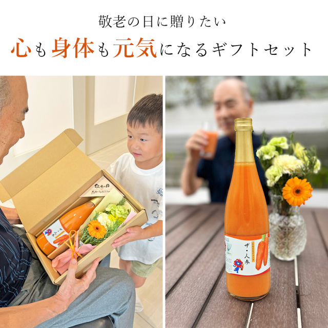 人参ジュースと花束の心と身体に優しいギフトセットです。