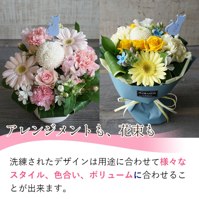 ※アレンジメント、花束、水引はひとつひとつ手作りの為、色合いや形が多少異なる場合がございます。予めご了承ください。