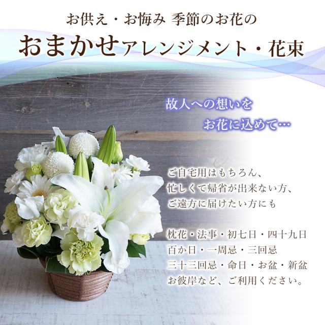 イメージ通りの供花を届けて頂きました。白を基調とした中に淡いブルーのお花でまとめてもらい私のお願いしたかった通りのアレンジメントでした。ありがとうございました。また機会があればお願いしたいと思います