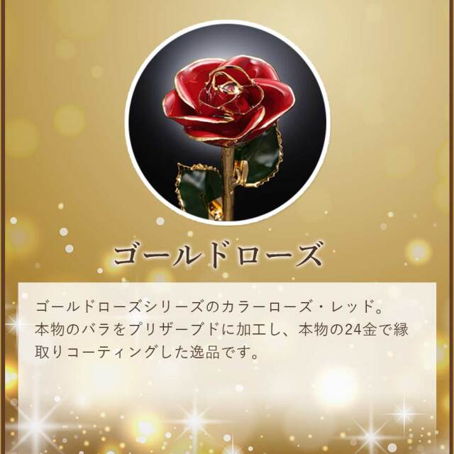 ゴールドローズシリーズのカラーローズ。本物のバラをプリザーブドフラワーに加工し、本物の24金で縁取りコーティングした逸品です。