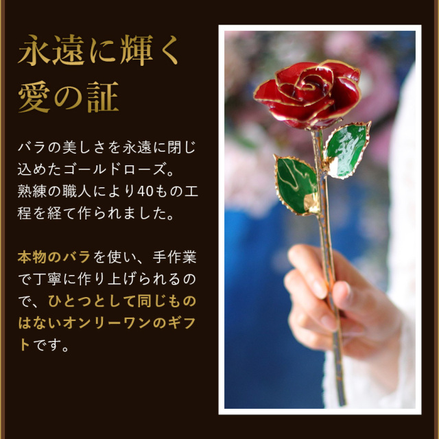 バラの美しさを永遠に閉じ込めたゴールドローズ。熟練の職人により40もの工程を経て作られました。