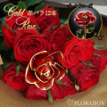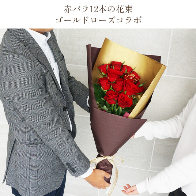 赤いバラと本物のバラを金でコーティングした豪華な花束。美しいお花と大切な思い出を永遠に美しいバラと共に残しませんか。