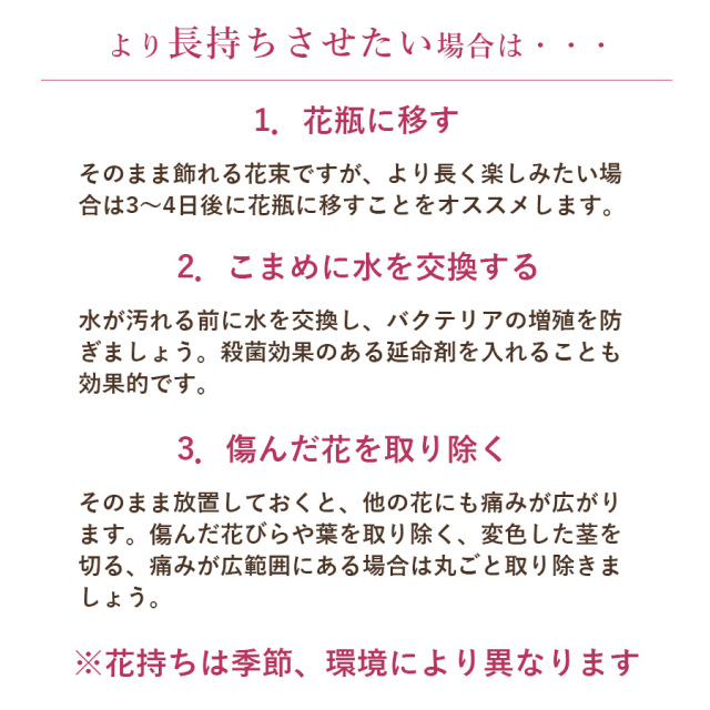 ※生のお花です。そのままでも楽しめますがより長持ちさせたい場合は花瓶に移し替えてください。