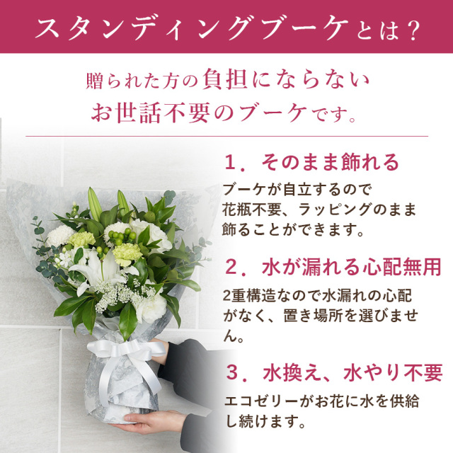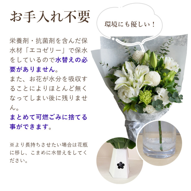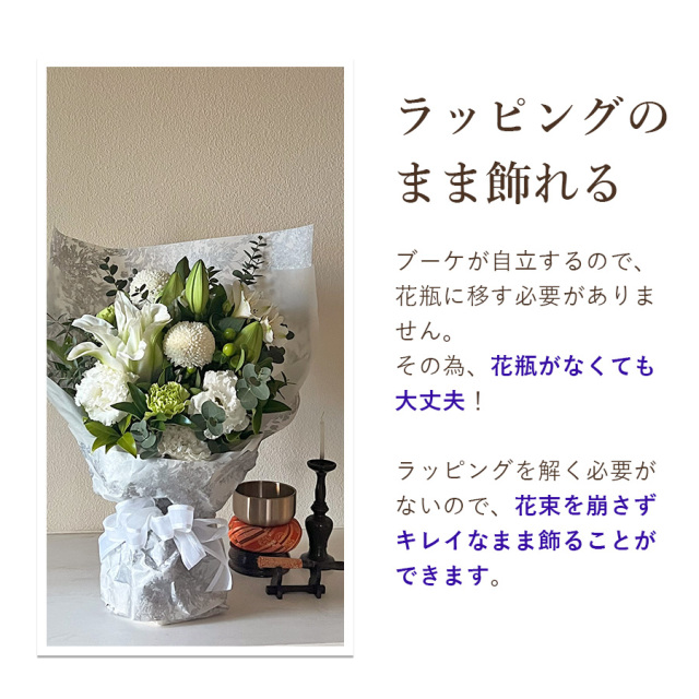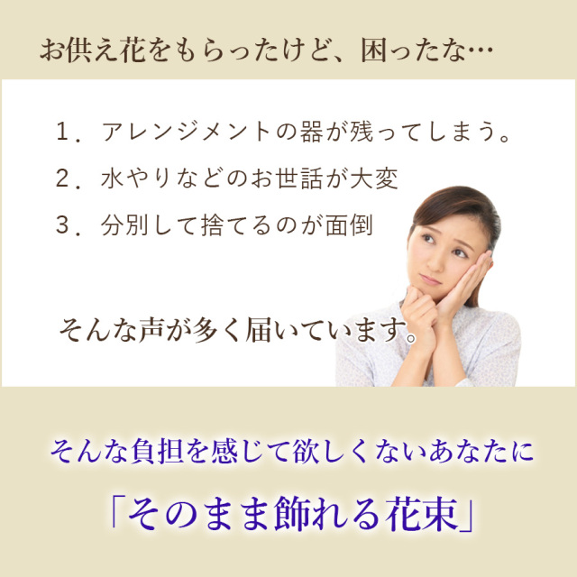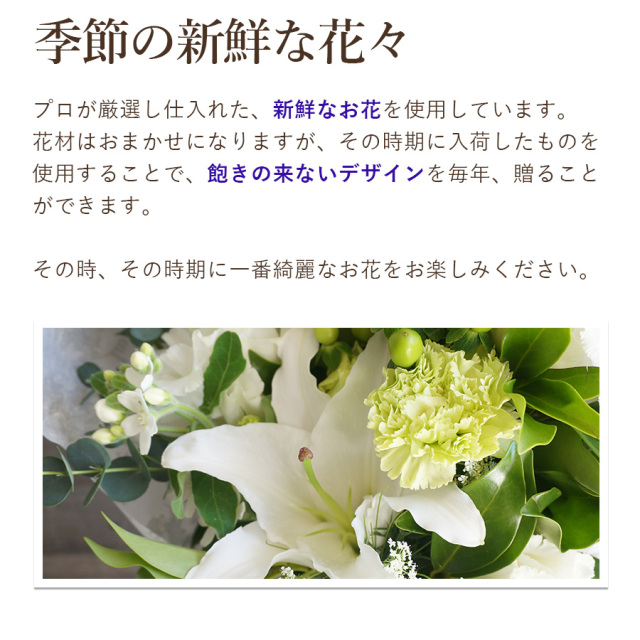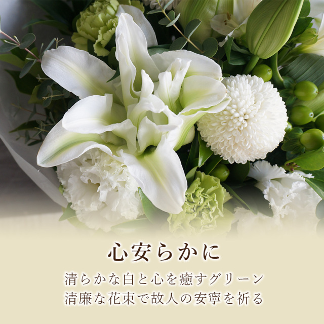 お花で温かく見送ってあげたい、命日に綺麗なお花を飾りたい、大切な人を亡くした方に負担を掛けずに贈りたい、そんな願いを叶える花束です。