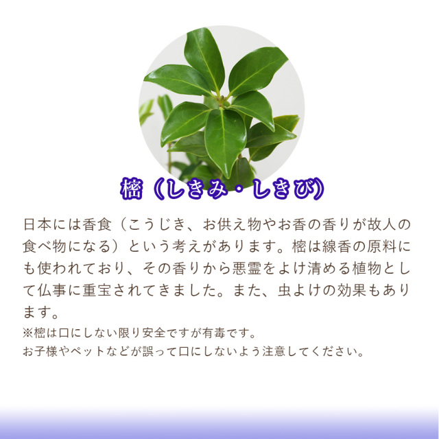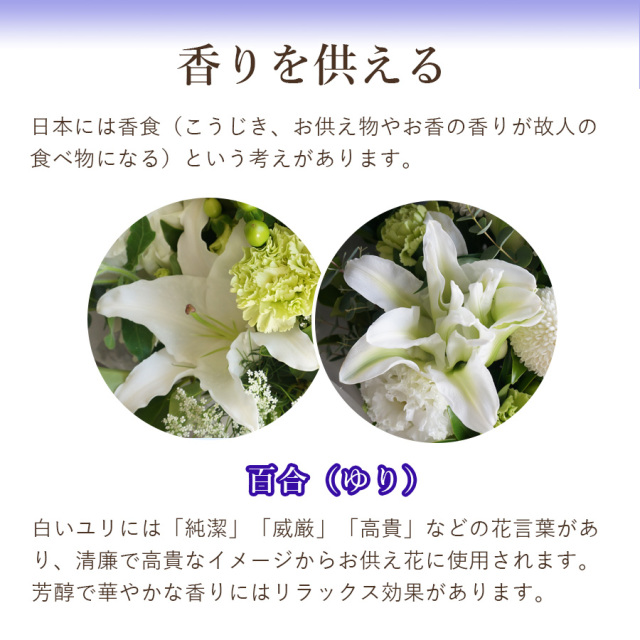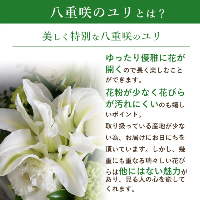 花材 : 百合(ユリ)、樒(しきみ・しきび)、マム(菊)、トルコキキョウ、カーネーション、ガーベラ、ユーカリ、小花など季節のお花