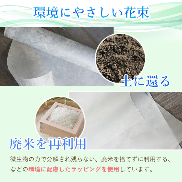 地表に落ちても残ることなく分解されるラッピングや廃棄されるお米を使ったラッピングを使用しています。