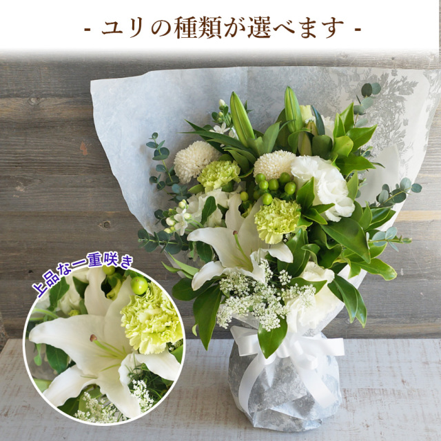 純白のユリと爽やかなグリーンのお花が清廉な雰囲気。