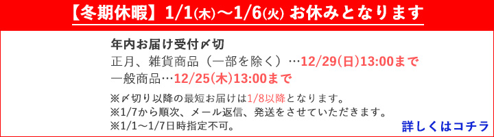 | 販売数量 | 実店舗でも販売しておりますので、在庫のある商品の場合でも売切れの場合がございます。ご注文いただきました商品が在庫切れの場合は、TEL、またはメールでご連絡差し上げます。 |